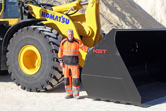 “Tidligere kørte jeg en lidt mindre Komatsu WA475-10 i omkring fem år. Men vi havde behov for at læsse lastbilerne højere oppe. Nu har jeg en maskine med længere arm, og læssehøjden er øget med 25-30 centimeter. Forskellen på de to maskiner er markant. Den nye WA485-11 har en skovl, der er en kubikmeter større, end på den lidt mindre WA475, og det giver halvanden til to tons mere pr. skovlfuld. Den kan løfte 12-13 tons, og tidligere brugte jeg fem skovlfulde til at læsse en lastbil. Nu nøjes jeg med tre”, siger maskinfører Søren Jakobsen.